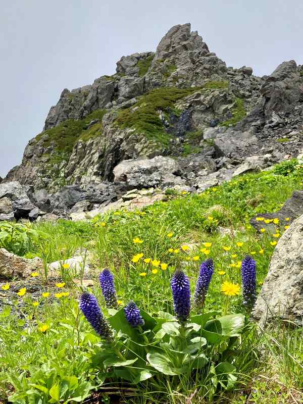 雪渓登りに慣れてきて楽しくなり始めた・・2時間ほどで、雪渓登りは終わり、土の夏道に戻ることに・・。GKリーダーによれば、もっと長く倍くらい登れる年もあるそうだが、今年は雪が少ないとのこと。残念! アイゼンを外し、土と岩の道を登り始めるとGKLの予告通りお花が待っていた。