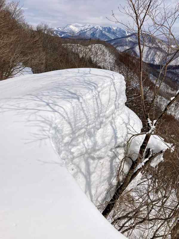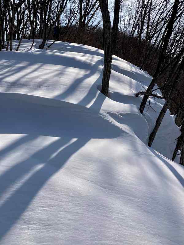 アップダウンを繰り返しつつ緩やかに下っていくと、思いの外、長いルートで、結局、予想をはるかに上回る行動時間8時間。だが、山行が終わってしまうのが惜しくてたまらないくらい、楽しい雪山だった。「雪は息をしている」確かにそう実感できる、雪山の多種多様な側面を見せてくれる山でした。