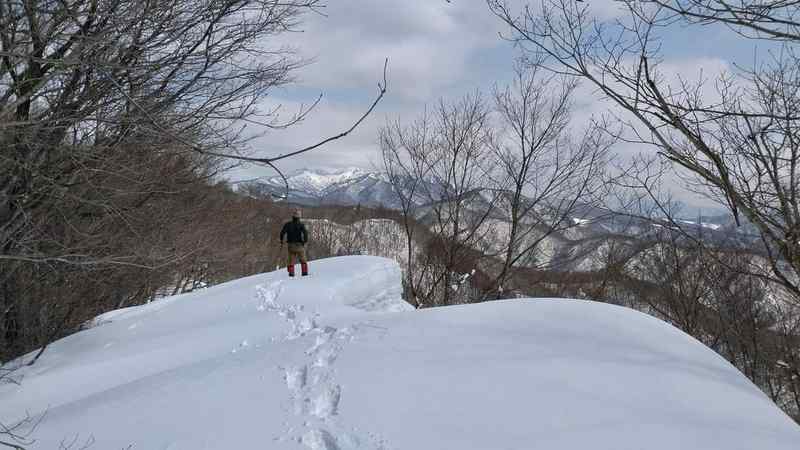 地図上に最初に川が出てくるので、「ここでドボンしたら、即終了だなぁ」などとドキドキしていたら、何てことはない小川で軽々と渡渉。やはり尾根は分かりやすく、雪質も積雪量もほど良く、快適に歩を進める。