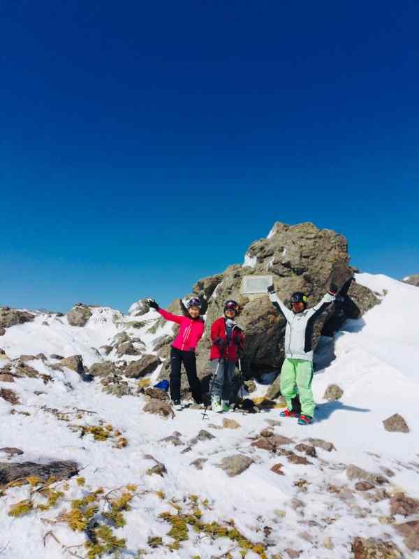 私は体力温存のため天狗原で眺めているつもりだったが、こんな良い時はなかなかないとの言葉に途中まで登って滑走すればいいやと気楽な気持ちで登り始めた。傾斜はきつくなり、キックターンも難しく途中からの滑走は無理とあきらめ稜線まで登る。「もうすぐで頂上だよ」との声に背中を押され頂上を踏むことが出来た。やり遂げた感がありとっても気持ちがいい。(頂上はもう少し奥だったようです)