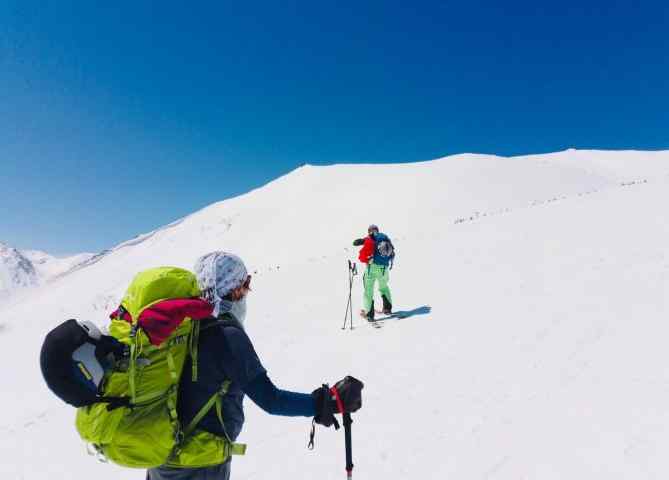 朝起きると今日も青空。食事を済ませ出発の準備をする。小屋の前で感じの良い小屋のご主人に写真を撮ってもらい、昨日恐怖だった橋を渡る際のアドバイスを受ける。「ザックに板を付け歩いて渡る方もいますよ」とのこと。安全策を取って、小屋から橋を渡り終わるまで歩いて行く。ほとんどがシールを張りスキーで渡っていました。