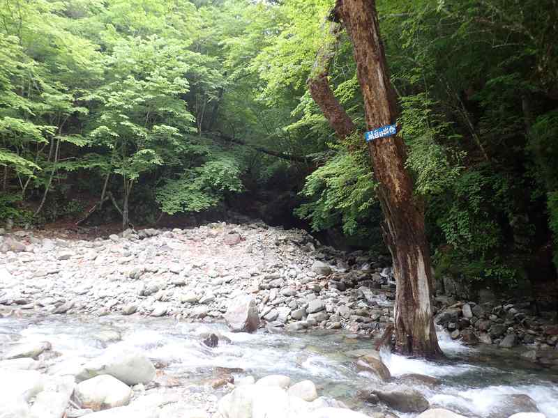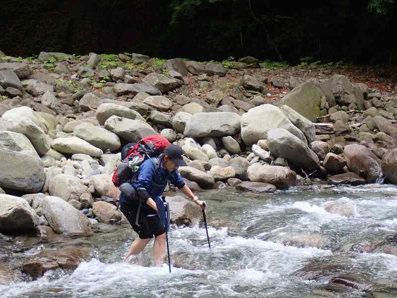 登山靴を脱ぎ裸足で入水し数歩進むと石で滑り水圧で流されそうになるがどうにか渡渉できた。この時は恐怖心で身体がすくんでしまった。