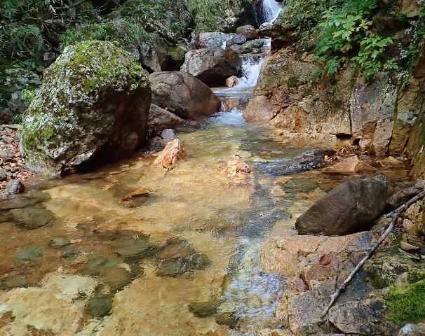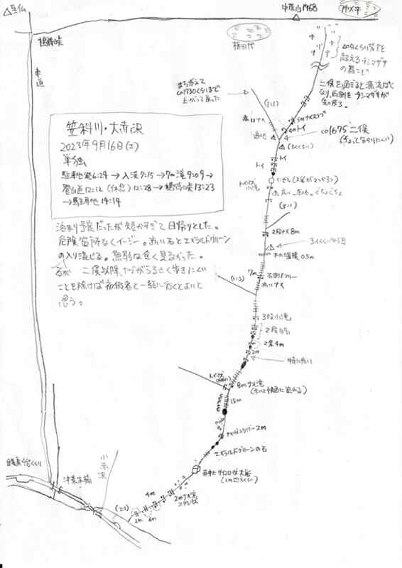 地形図にある1675mのはっきりとした二股がなかなか現れず、見落としたかなと思って15分くらい戻ると二股があった。出合い手前の小滝を小さく巻いた際にそのまま反対の沢に入ってしまったことが分かった。注意不足。