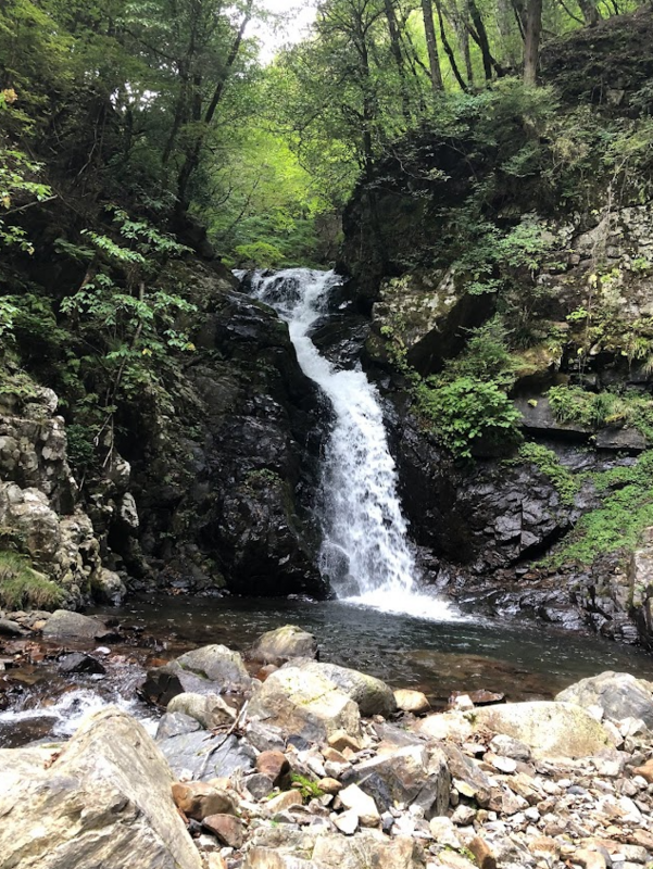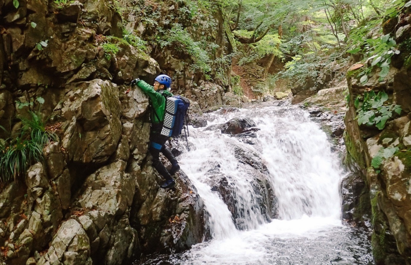 水量も多く上部が狭まっているのもあり水が噴き出していて大迫力。登れないので左岸から巻いて突破した。巻き道も足場の悪い箇所にフィックスロープがあり初心者にも優しい。