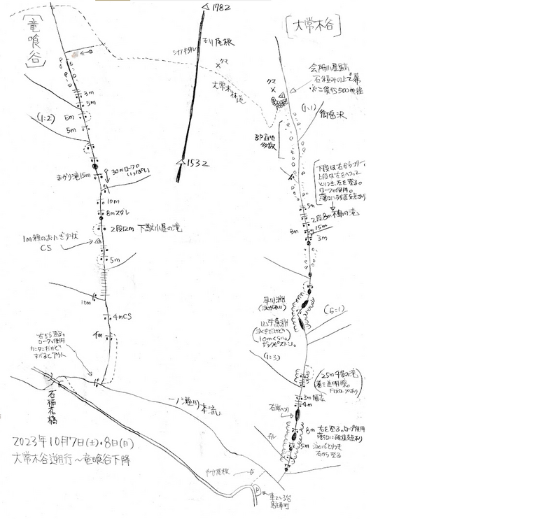 竜喰谷と一ノ瀬川の合流地点は下流に大きな滝がありスリップしたら奈落の底ということでロープを出して突破。一ノ瀬川は水量が多く水圧が強いから少しひやひやした。