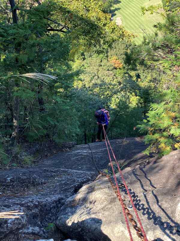 鹿沼岩山2023年10月18日 花子大宮 岩稜・フリークライミング2023年10月18日クライミング仲間のIさんと鹿沼の岩山を登った。 登り初めから岩が出てきて、テンション上がる。 三番岩、二番岩、一番岩を登ったり、巻いたりしながら、目的の猿岩に到着。 ハーネスを付けて、ロープを準備し、懸垂下降開始。70メートル壁の出始めは、やはり緊張する。 ロープが落ちてこないハプニングも乗り超え、壁下に到着し二人でほっと一安心。 帰りの新鹿沼駅で地元のお爺さんに、「よく登ったね」と褒められた。 リーダー I村 記録 MS