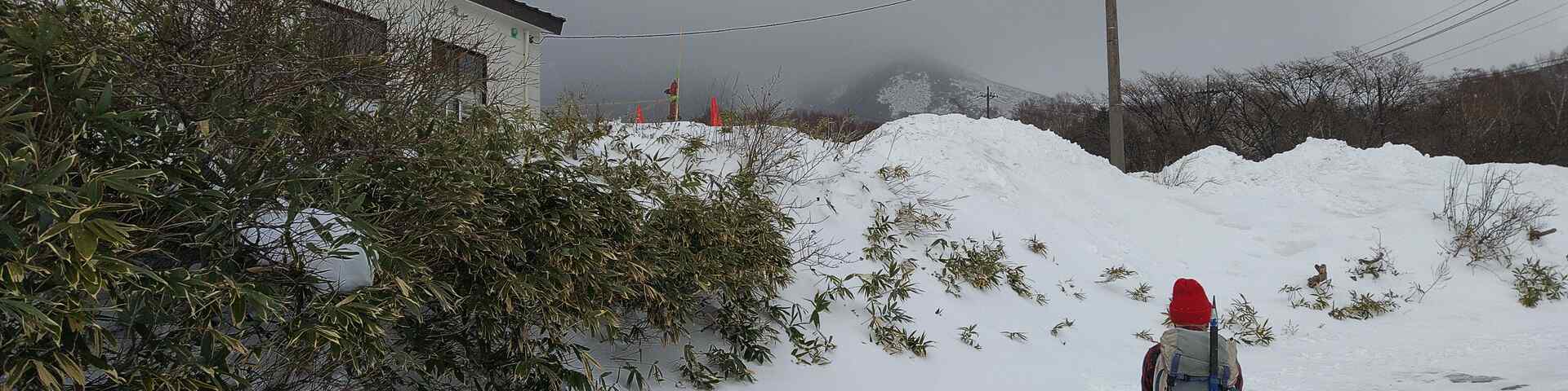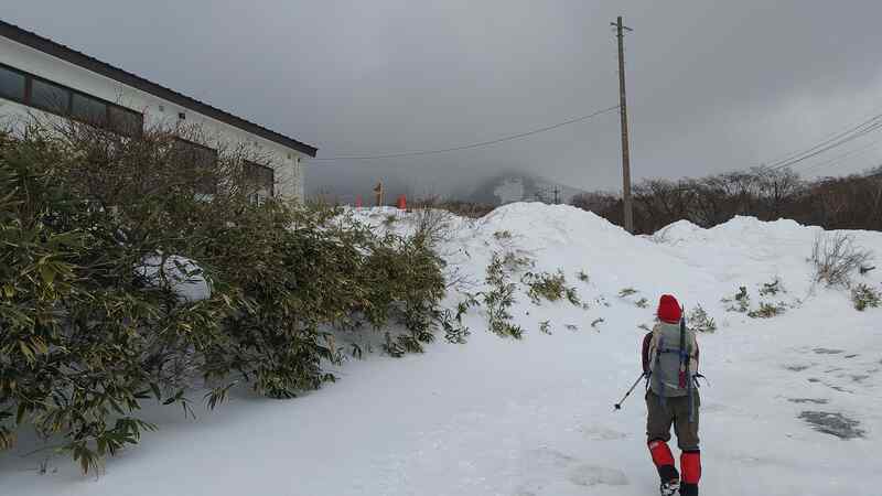 そんな予報に、気候不安定な那須でも山頂まで行けるかな?と期待して家を出たが、車が那須に近付くにつれて雲が厚くなり雨に。標高を上げると雪になり、なんとか登れるかと胸を撫で下ろす。