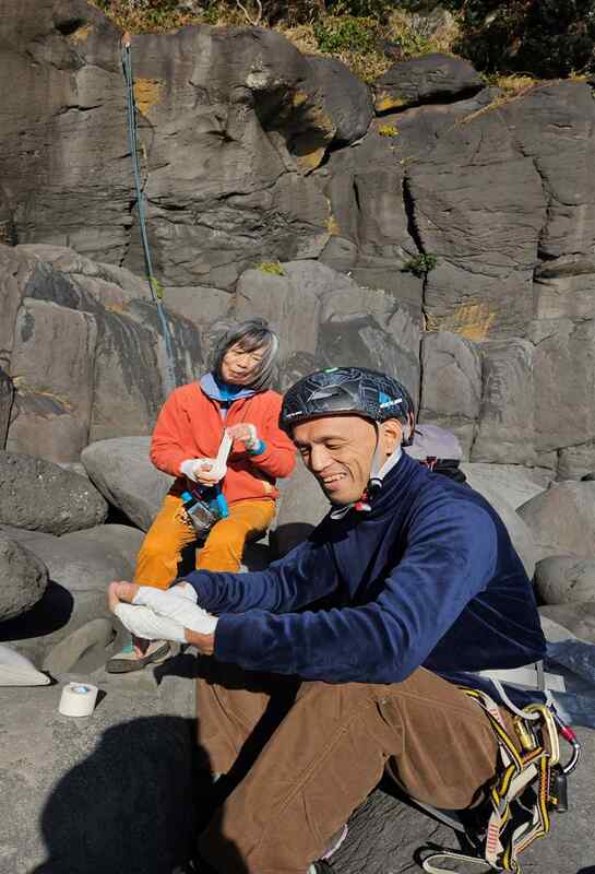 その間、S田とさん指示でトップロープ設置。ここはクラックの練習に最適。まずは手のテーピング説明、実施。手・足のジャミング、トップロープで体験しながら実施。純、鬼殺し、おばすて正宗、その右の易しいルートをお互いビレイしあい登った。