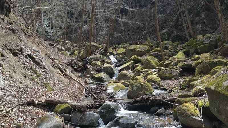 10 分ほど林道を歩きのある場所を目安に入渓しました10 時頃、標高約 800m。ま 4 なので水冷たくないだろうか、寒いのではないかと案じておりましたが、そんな心配はいりませんでした。よく晴れた青い空、周囲の苔と新芽の緑、黒い岩の間を白く流れる水、いろいろな要素の自然の美しさに囲まれて歩ける沢山行は魅力的です。