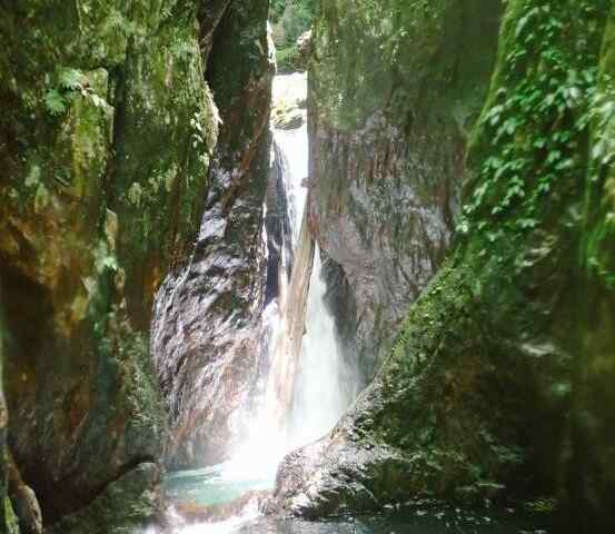 2日目は高巻きから。尾根を上がって別の支尾根に移ってゴルジュ帯をまるごと巻いた。50分。巻き降りると目前に石楠花沢との出合にかかるマミヤの大滝20mが轟々と流れ落ちている。こんな奥深いところに見事な滝が在ることに感動する。(因みに登山体系だと60mとなっている。今よりもっと困難な遡行であったことを想像すると単なる誤記ではなく、そう見えたのかも)。