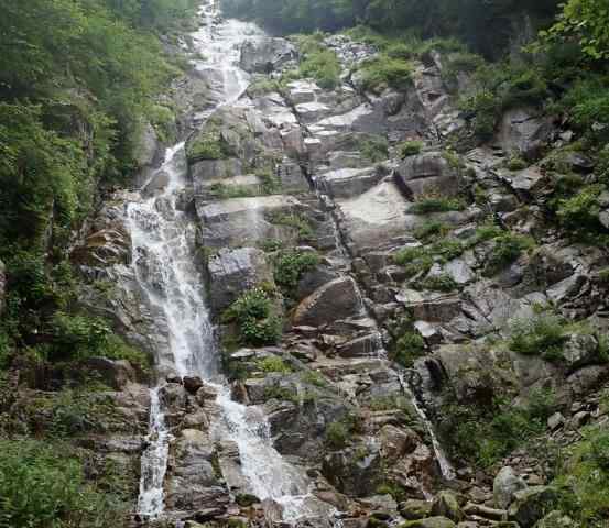 大滝までは割と単調な渓相が続く。たまに出てくる滑に目を引かれるくらいか。幾つも架かる堰堤がなければまた印象は違ったかも。それでもここしばらくの雷雨のせいか今日は水量が多いようで悪そうな滝は巻いていく。奥の二股を越えると連瀑帯になる。どれもフリーで登れてぐんぐん標高を上げていく。すぐに100mの大滝下段に着く。遠くから見ると長い一本の滝に見えたが、実態はいくつもの滝で構成されている。