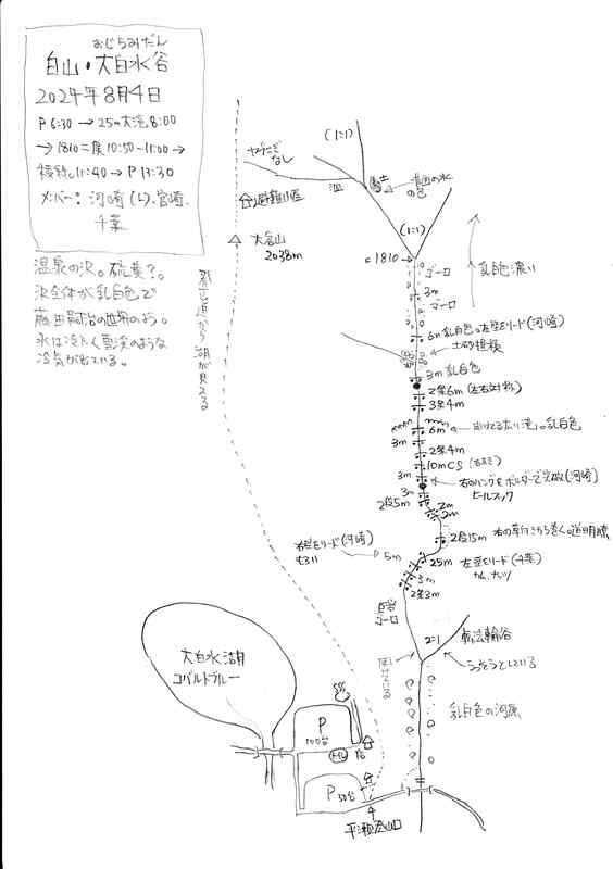 登山口側の橋からすぐに入渓できる。白山の雪解け水のせいか、沢からは雪渓のような冷気が出ていてひんやりしている。沢の色は温泉成分たっぷりのようで(硫黄かな?)沢が全て乳白色だ。藤田嗣治の絵画みたい。