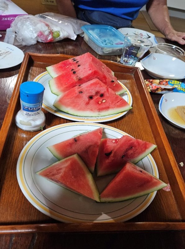 部屋は1Fで貸し切り、少し湿気を感じるもテレビもあり冷蔵庫もある、そしてその中に大玉のスイカが鎮座していて、後でオーナーさんから差し入れがあり皆でスイカをむさぼった「美味しい!ありがとう」を連発して、お礼を言う。なんだか得をした気分で早めの就寝です。