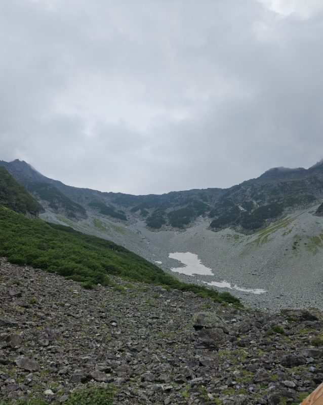 翌日の北尾根のアプローチを偵察に行く、午後からガスってきて北尾根の稜線は見え隠れする、池の平の池を左から岩が積み重なった部分を詰めて、トレースが明瞭になるところまで下見です。なんだか時間がかかりそうな雰囲気。元来た道を戻って小屋に帰り、夕食まで時間があるのでテラスで小宴会、生ビールが五臓六腑に染み渡る。夕食は5時からで、10年前に比べて食材が良くなっているような・・・・。