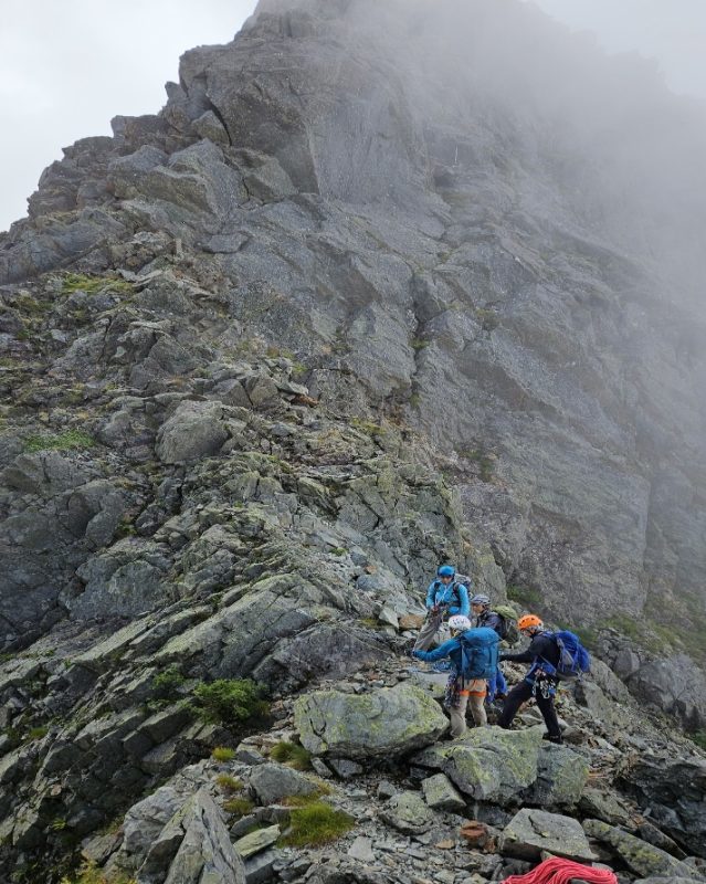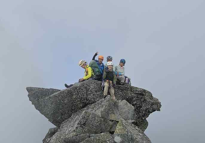 4峰の尾根上を下って3.4のコルに下降して、これから登る3峰に向かい合う。これまで3回も登っている3峰を正面に見ても登攀ルートの記憶が蘇らない?取り敢えずここでロープを出してのマルチピッチの登攀の始まり、オーダーはT田さん、M堀さん、前野さんの1パーティー、S田、K木さん、I田さんの2パーティーの3人登りです。3峰の上部は雲がかかって来て先が見えなくなっている。