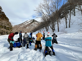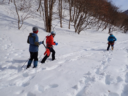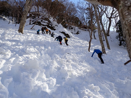 ツボ足での登り、ワカン・スノーシューを用いた登りで差を体感する。実際に同じ雪質のところで足を変えて歩くことも無いのでスノーシューの浮力について実感できた。