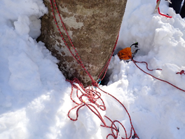 シャフトにスリングを通し、カラビナを用いて支点とする。この時、アイゼンでスリングを踏まないように。