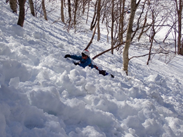 そして見当をつけたら直上ではなく、雪崩れた谷側から掘っていく。