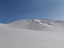 滑走班が戻ってきたので、下山開始。スキーを滑走モードにして山をトラバース。雪崩に気をつけながら、リーダーの後を続けて滑った。リフトトップが見えてきた。一安心して宿泊地まで滑りおりた。