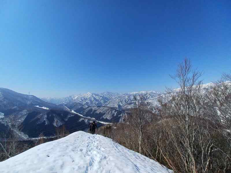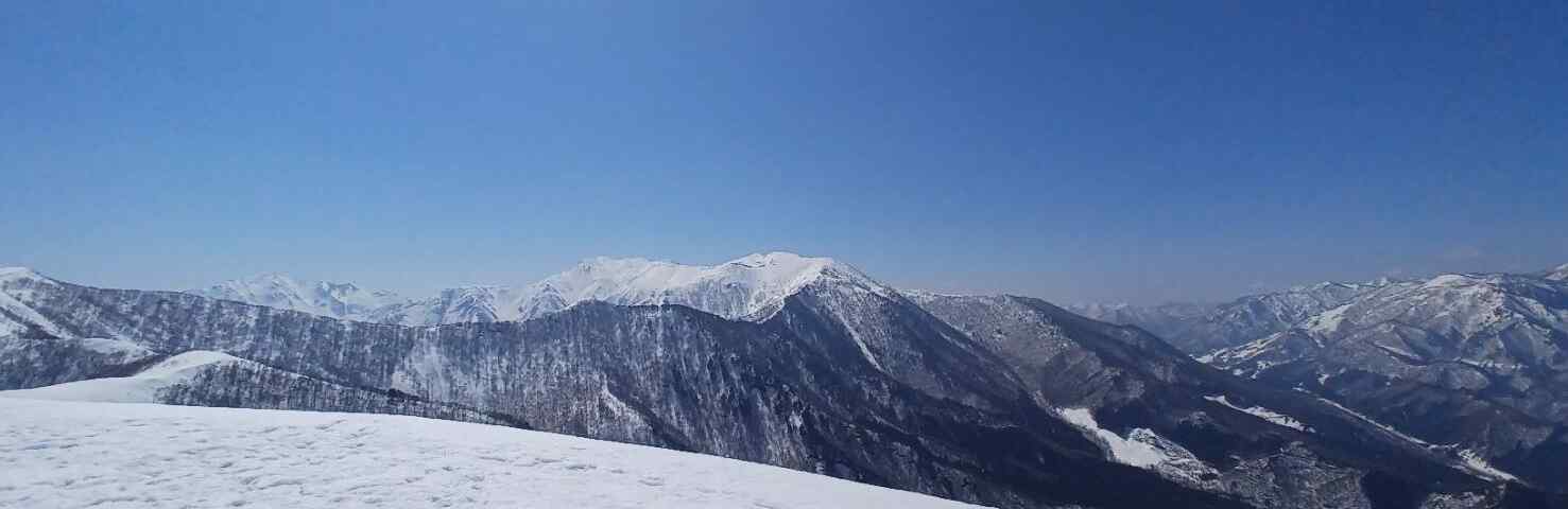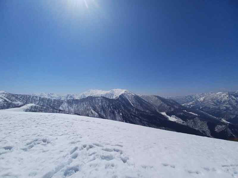 東谷山、日白山、二居俣の頭、どこからも最高の展望があります。夫々なだらかで平らで広いので、ゆっくり休憩できます。日白山山頂は4~5パーティーで賑わっていました。暑いくらいで、長袖Tシャツ1枚でいられるほどでした。下山はかなりの傾斜で、時期によってはピッケルが無いと厳しいかと思いますが、今回は雪が緩んでたので、ピッケル無しで降りられました。とにかく最高の景色とコンディションで大満足の雪山でした。