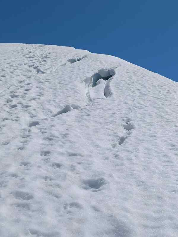 トレースがあったので、迷うところはありませんでした。雪はこの時期にしては、多く、東谷山へ向かう尾根上の雪が無い所が2箇所くらいあり、藪こぎ迂回しました。クラックもありましたが、歩行には影響無し。シャーベット状の雪なので、ツボ足もアリですが、アイゼンを着けた方が、滑らず歩きやすかったです。踏み抜きは所々あり。この周回は今週が最後かも?と思いました。来週は藪こぎ箇所が増えるかも?