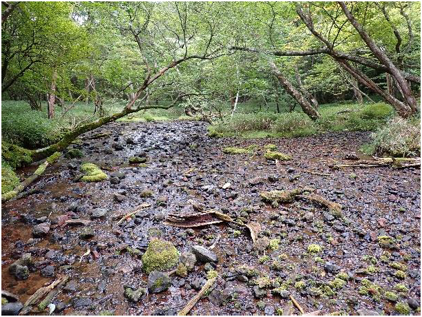 涸れてからは笹ヤブをいくらか漕いで一般道へ出る。多少、笹で滑るが踏み跡もあって歩きやすい。登山道をそのまま下ると入渓点のお社に戻る。