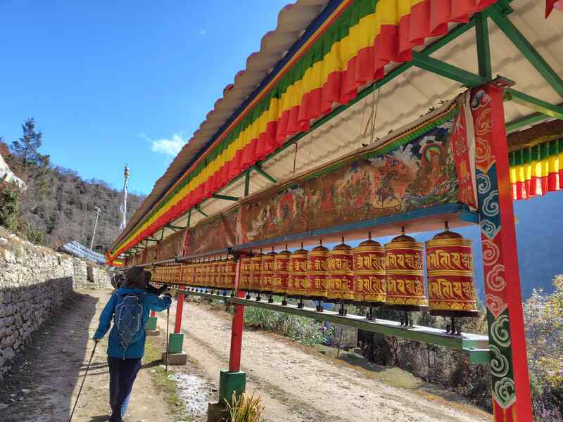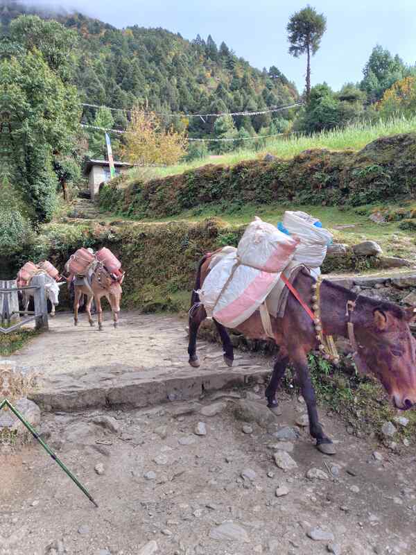パクディンのロッジを出発し、果てしなく続く石畳の階段を上る。ロッジが点在し、ランチやアフタヌーンティーのために休憩しながら進む。気を遣うのはロバの糞を踏まないように歩くこと。