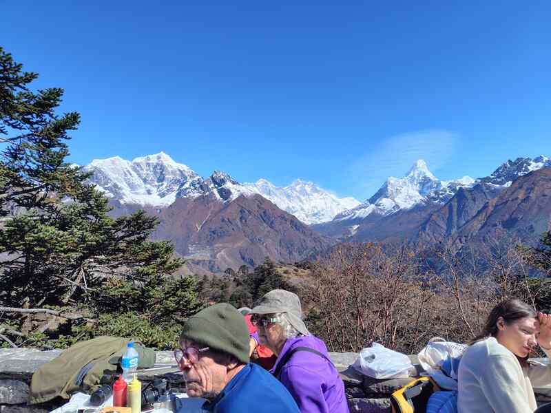 景色の良いカフェのテーブルがすごく混んでいた。チョーオユー、エベレスト、ローツェ、アマダブラムが眺められる。ここまで来て帰る観光客もいるそうだ。