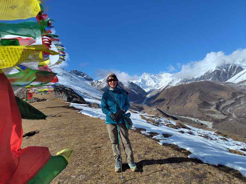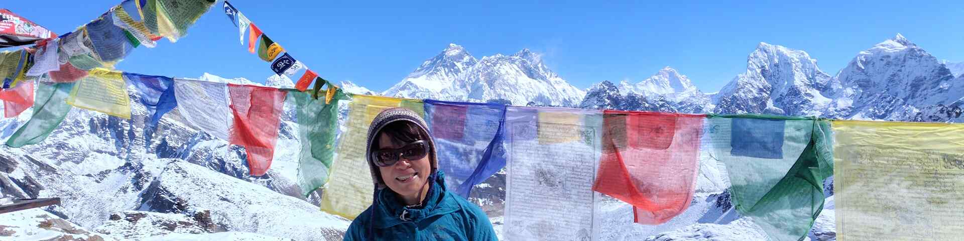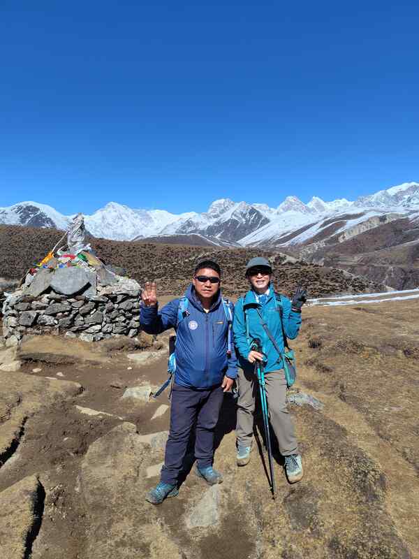 この日は長丁場。レンジョパスまで雪山をひたすら登る。太陽の光が痛い。鼻と唇が火傷したみたいにヒリヒリする。レンジョパスを過ぎるとひたすら降りる。ロッジはしばらくないので、持参の水とおやつで休憩。でも景色は抜群。遠くマカルーまで見える。
