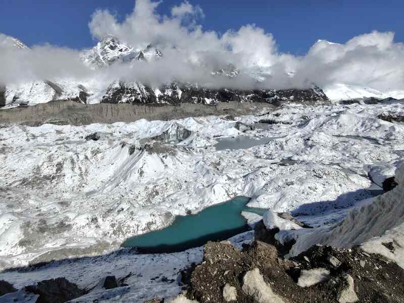 ゴーキョまで4時間。氷河を見るため近くのモレーンに登る。氷河越しにチョーオユー、エベレスト、ローツェなどが見える。