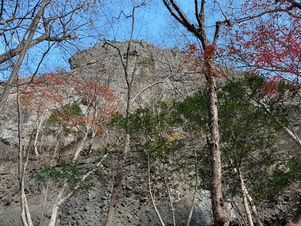 登山道を道なりに進むと40分ほどで取り付きの洞窟に着く。見上げる木戸壁はゴツゴツした岩肌が荒々しく聳えている。
