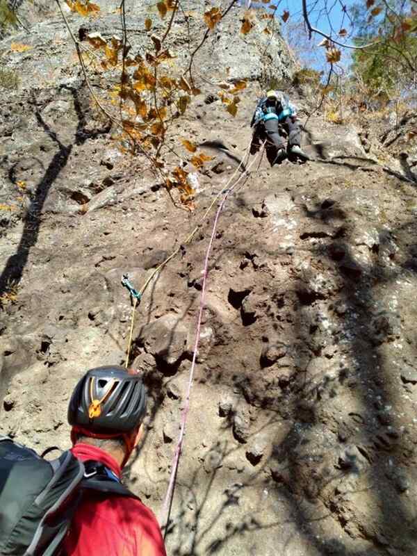 4p目を越えて最後の5p目は緩い斜度だが、眼前の土を被ったトイ状を避けて、直登せずに右に回り込みながら登ると終了点だ。結城さんの到着を待って懸垂下降の体勢を取る。ここの岩はたどん岩というらしく、ゲンコツのようにボコボコした岩が張り出し、ロープを投げ落とすと引っ掛かってしまうので腰の左右からロープを繰り出して懸垂下降する。